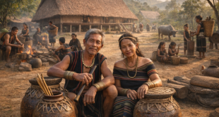 Làng truyền thống thường là tập hợp các nhà sàn dài, đặt dưới sự điều hành của người đứng đầu làng cùng hội đồng người cao tuổi và luật tục.27 Ở đây, làng không chỉ là đơn vị cư trú, mà còn là không gian pháp lý – đạo lý: nơi xử lý xung đột, phân chia trách nhiệm nghi lễ, phối hợp sản xuất và duy trì quan hệ với thần linh bản địa. Khi chính quyền hiện đại, bộ máy xã – ấp và luật pháp nhà nước thâm nhập sâu hơn, vai trò của cơ chế làng truyền thống bị thu hẹp, nhưng không hoàn toàn biến mất; ở nhiều nơi, uy tín của già làng và người am hiểu tập tục vẫn rất quan trọng trong việc hòa giải, cưới hỏi, tang ma và tổ chức lễ cộng đồng.
